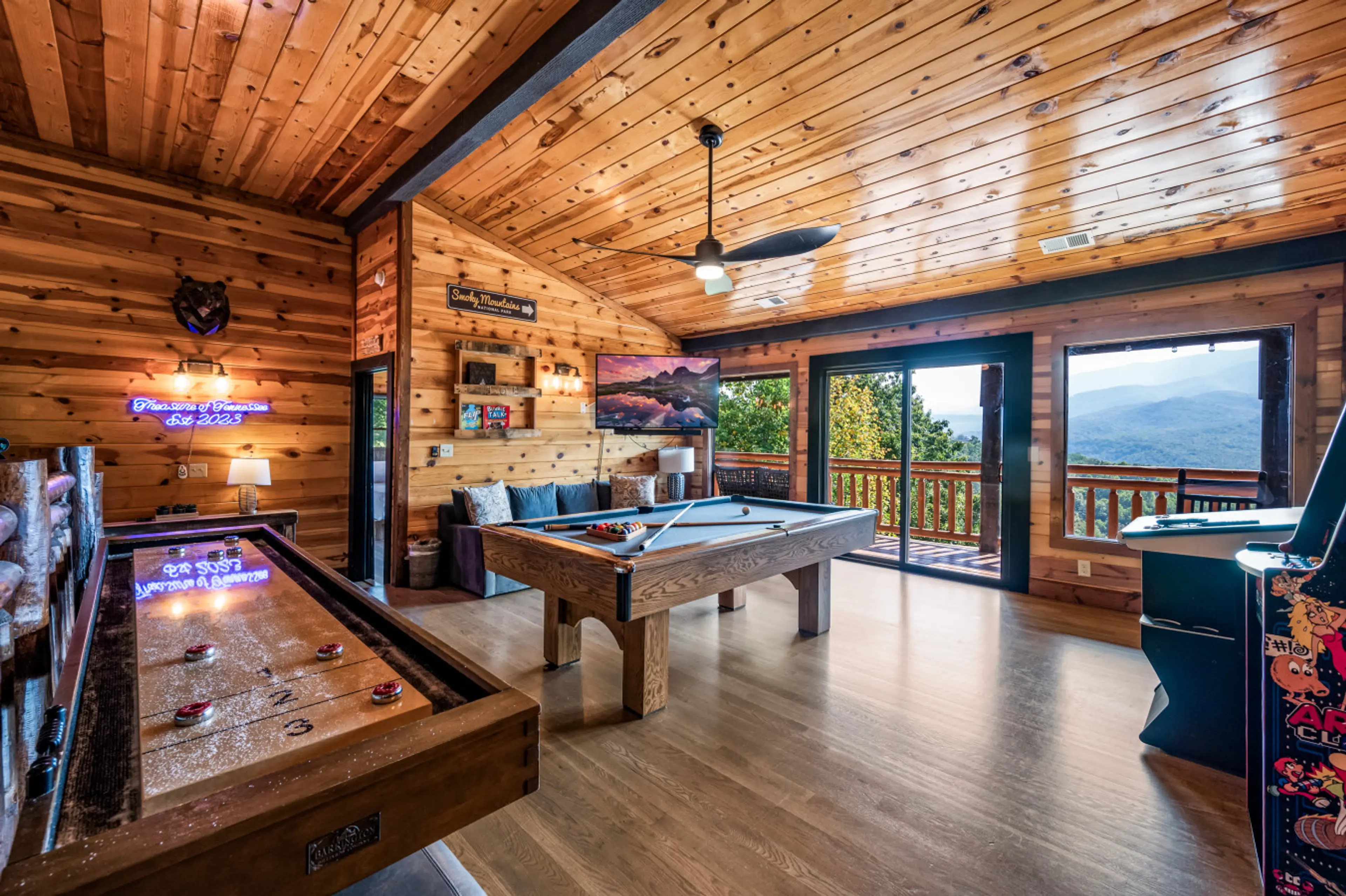 Welcome to Treasure of Tennessee! This 6BR cabin features ensuite baths, a spacious, cozy living room with a 65" Smart TV and fireplace, Smart TVs in all bedrooms, 24/7 indoor pool access, 2 private hot tubs, and a game room with a pool table, arcade, and board games. Relax outdoors on rocking chair...