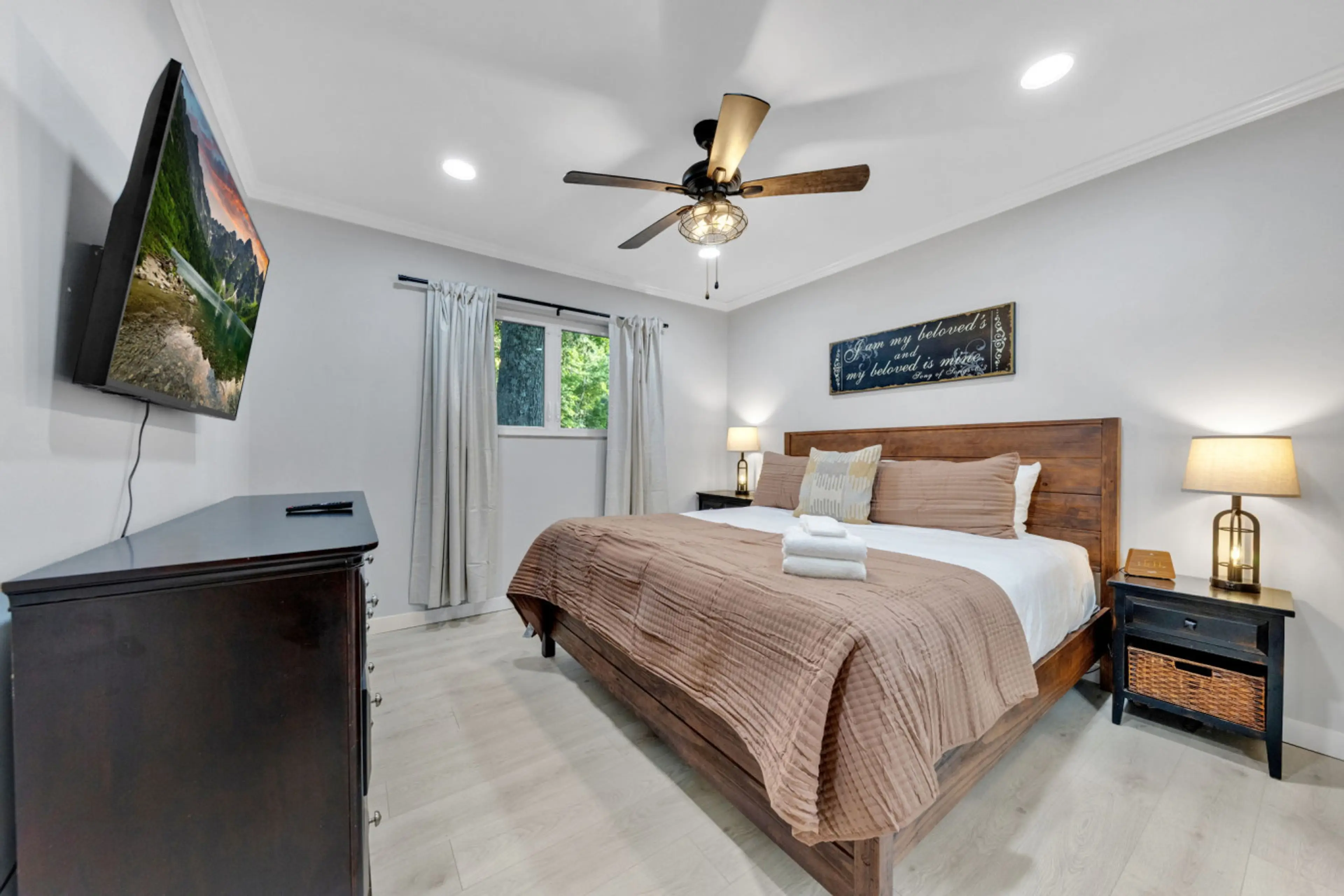 Discover The White Lodge, this charming single-level home features 4 bedrooms and 2 bathrooms, a spacious seating area with a 65" Smart TV, and a fully equipped kitchen for all your cooking needs. Enjoy cozy evenings around the outdoor woodburning fire pit, perfect for gathering with family and frie...