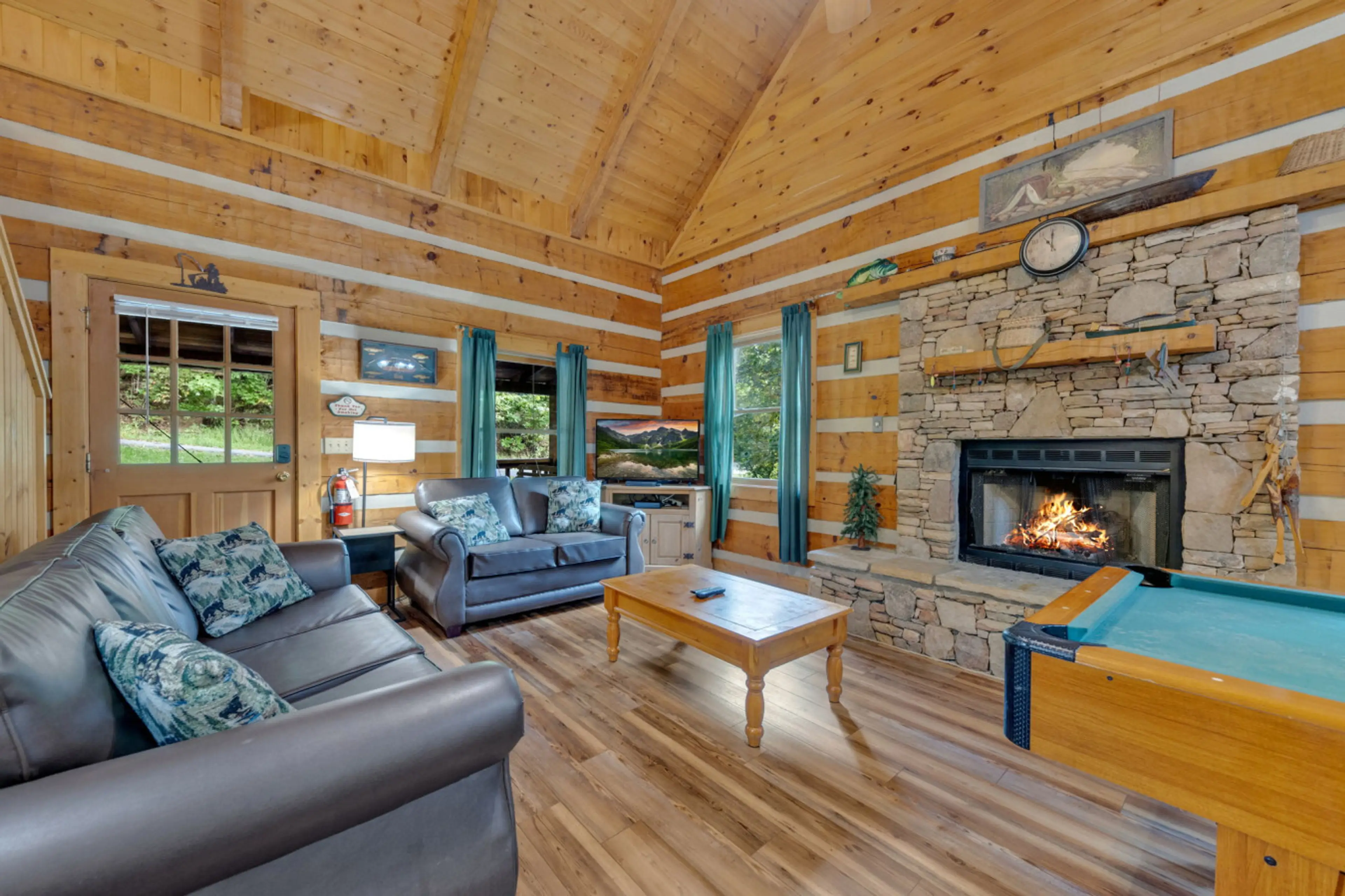 NEW LISTING! Discover this PET FRIENDLY, secluded 2-bedroom cabin with a rustic interior, featuring a 43” Smart TV, fireplace, pool table, queen sleeper sofa, loveseat, and coffee table in the living room. The upstairs bedroom includes a Roku TV for added entertainment. Step outside to enjoy a BBQ g...