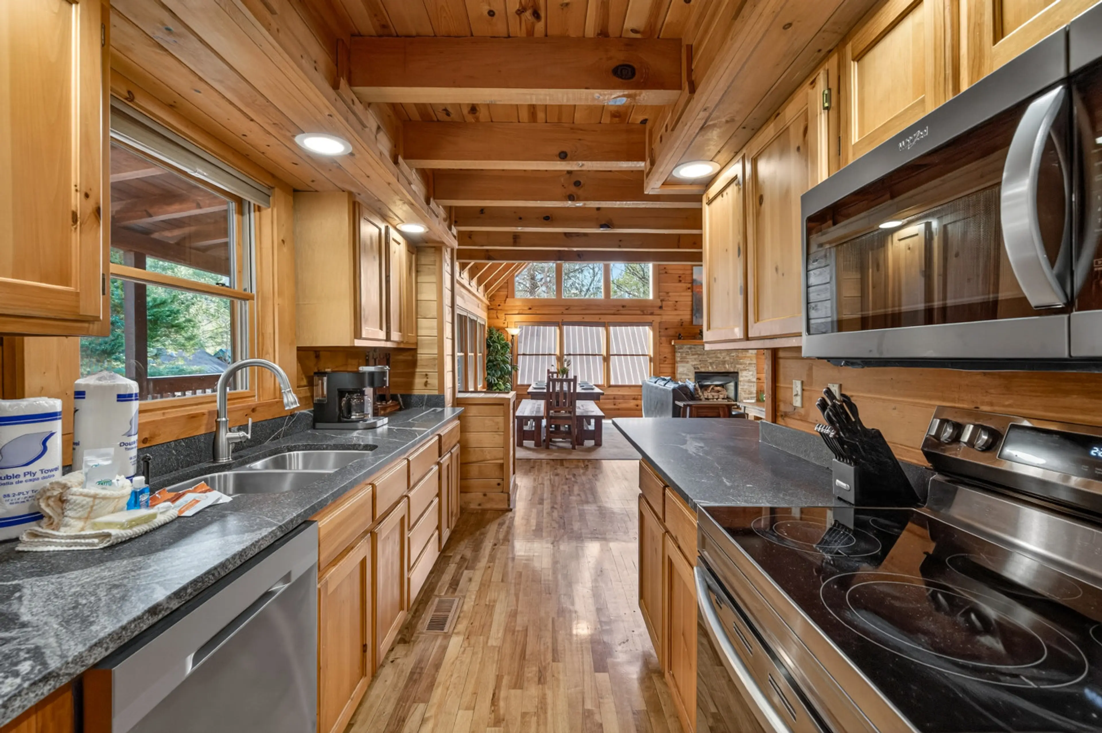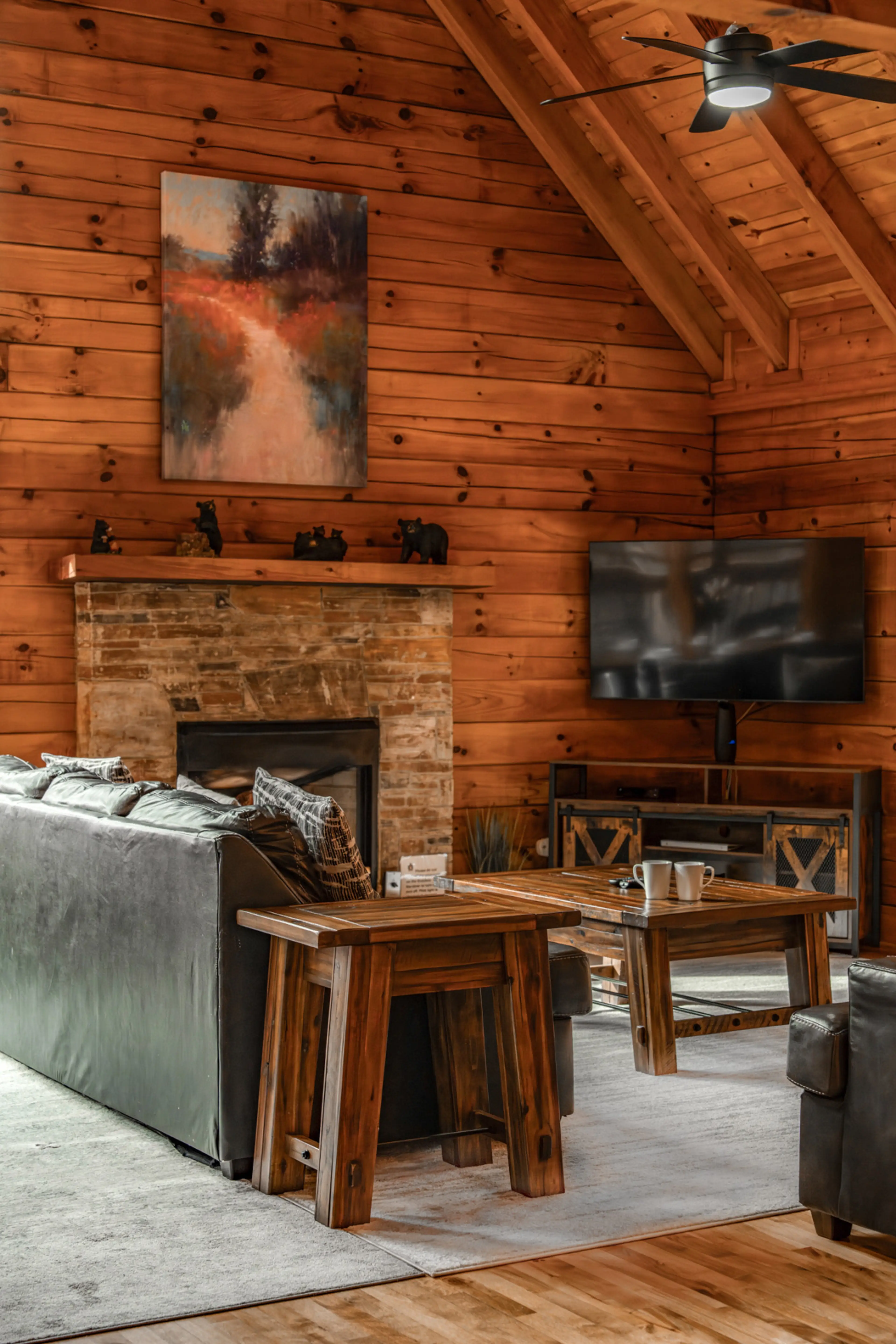 Welcome to a true cabin escape where rustic comfort meets space and convenience. This family-friendly cabin sleeps up to 9 guests and features 4 bedrooms and 3baths. Relax by the living room fireplace with a 55” Smart TV, egg chair, loveseat, and coffee table. Enjoy a 2-player multicade machine, out...