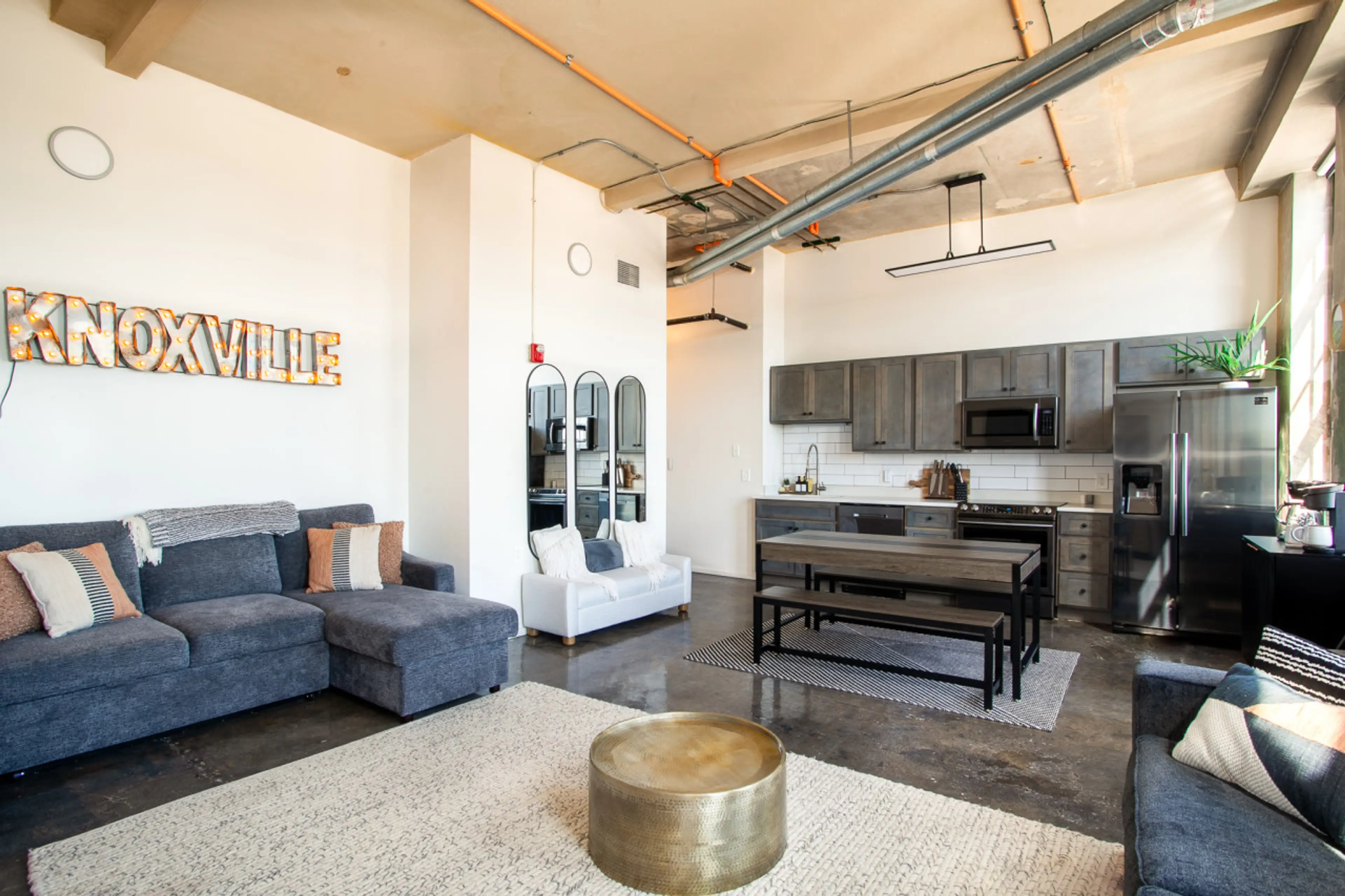 Spacious loft in the heart of downtown Knoxville! When you stay here you are surrounded by some of Knoxville’s best eateries, shops, theaters, and college football…all within walking distance! Just a 2.5 minute walk to market square! • 75-inch smart TV in the living room with YoutubeTv provided and...